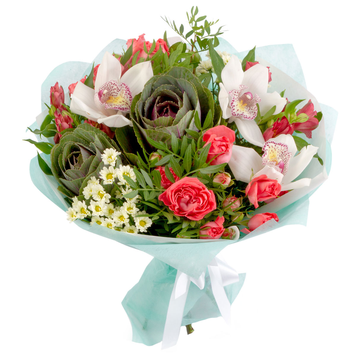 | Состав | Альстромерии, Брассика, Кустовые розы, Матрикарии, Орхидеи, Розы, Ромашки |