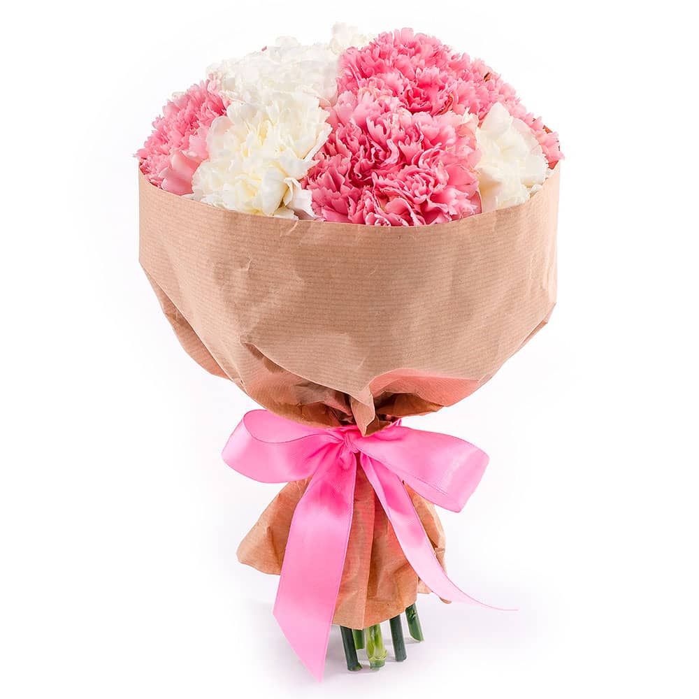 Гвоздики микс (белая, розовая). Упаковка (лента, пленка, крафт, сетка, пленка матовая)
