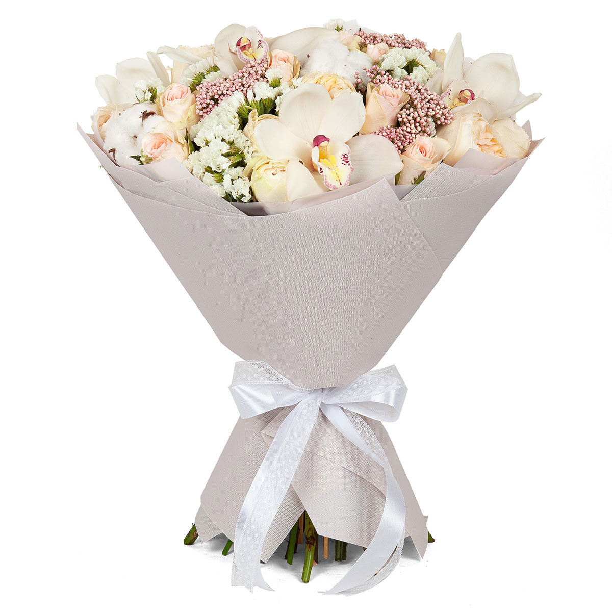 Орхидея белая, роза одноголовая кремовая, статица белая, озотамнус, хлопок. Упаковка (лента, пленка, крафт, сетка, пленка матовая)
