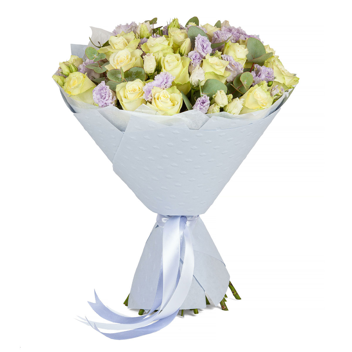 Роза одноголовая кремовая, эустома сиреневая, эвкалипт. Упаковка (лента, пленка, крафт, сетка, пленка матовая)
