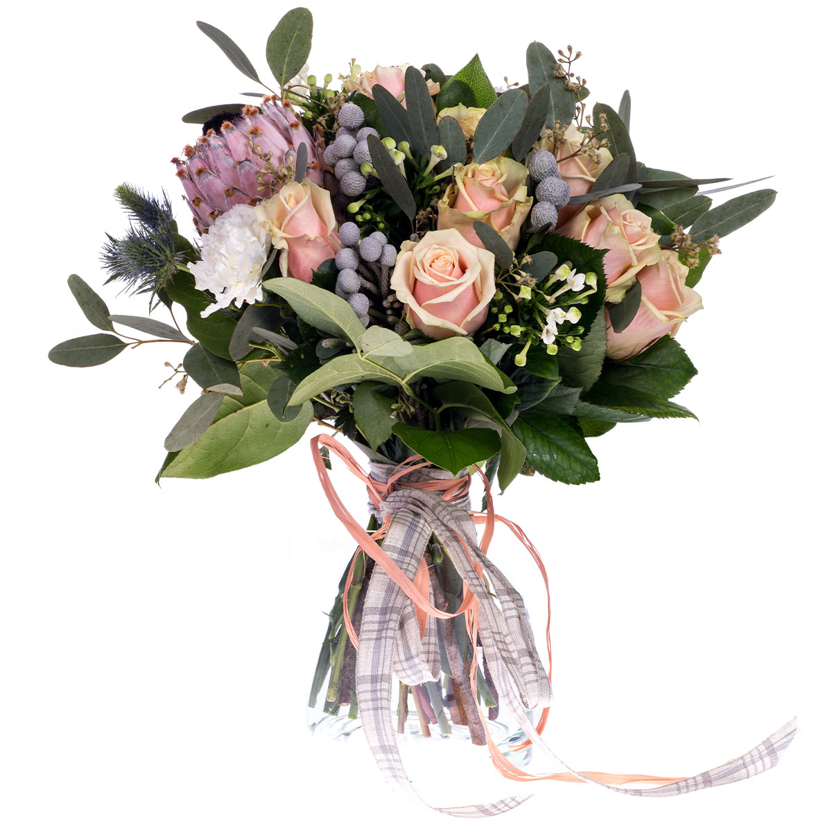 Роза одноголовая кремовая, эрингиум, бруния, протея, хризантема белая. Упаковка (лента, пленка, крафт, сетка, пленка матовая)
