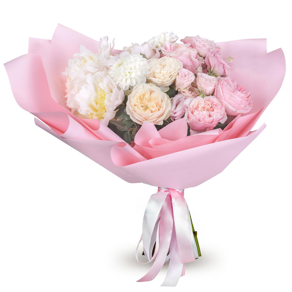 Пион белый, розы пионовидные розовые, георгин белый, эвкалипт. Упаковка (лента, пленка, крафт, сетка, пленка матовая)