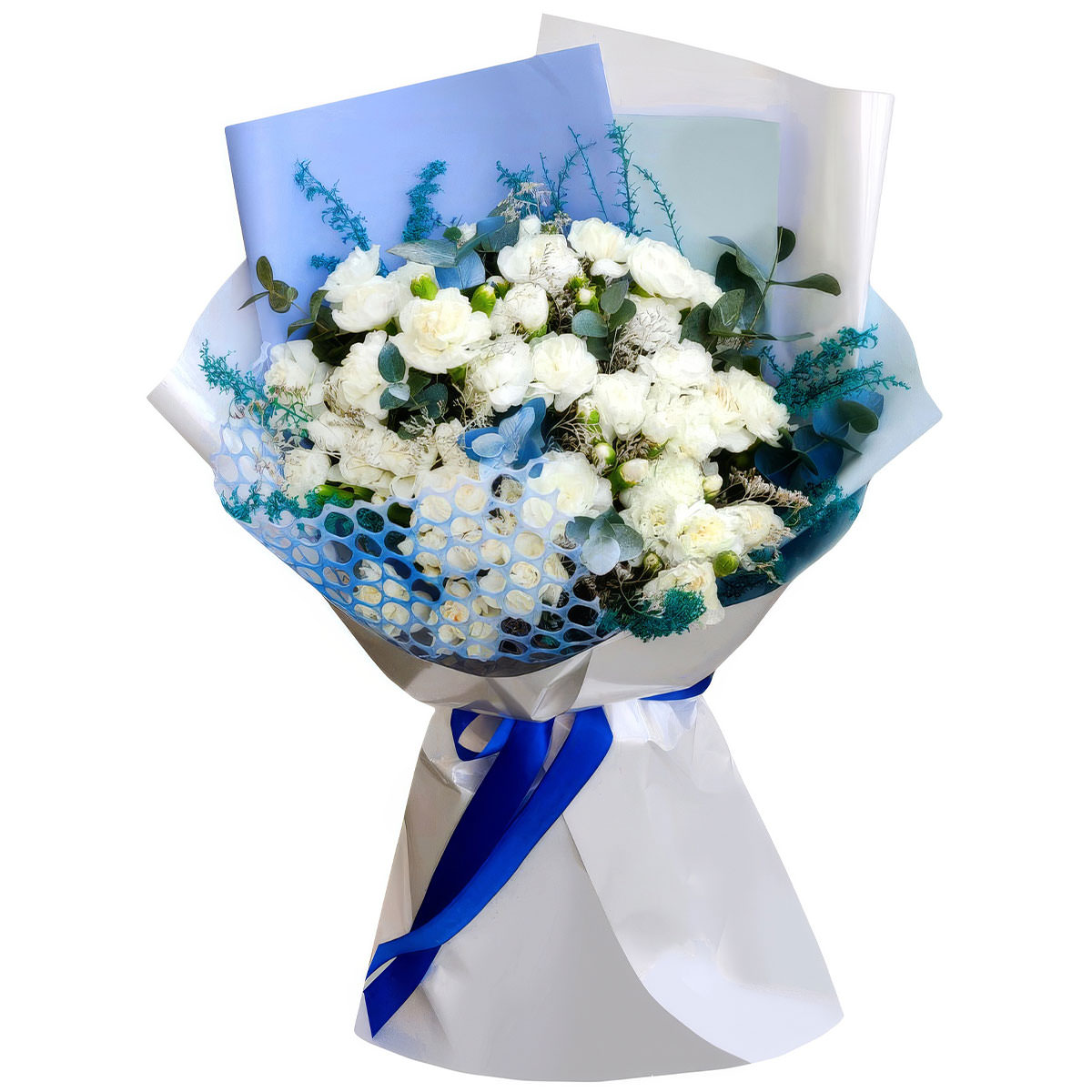 Роза кустовая белая, эвкалипт, сухоцвет. Упаковка (лента, пленка, крафт, сетка, пленка матовая)