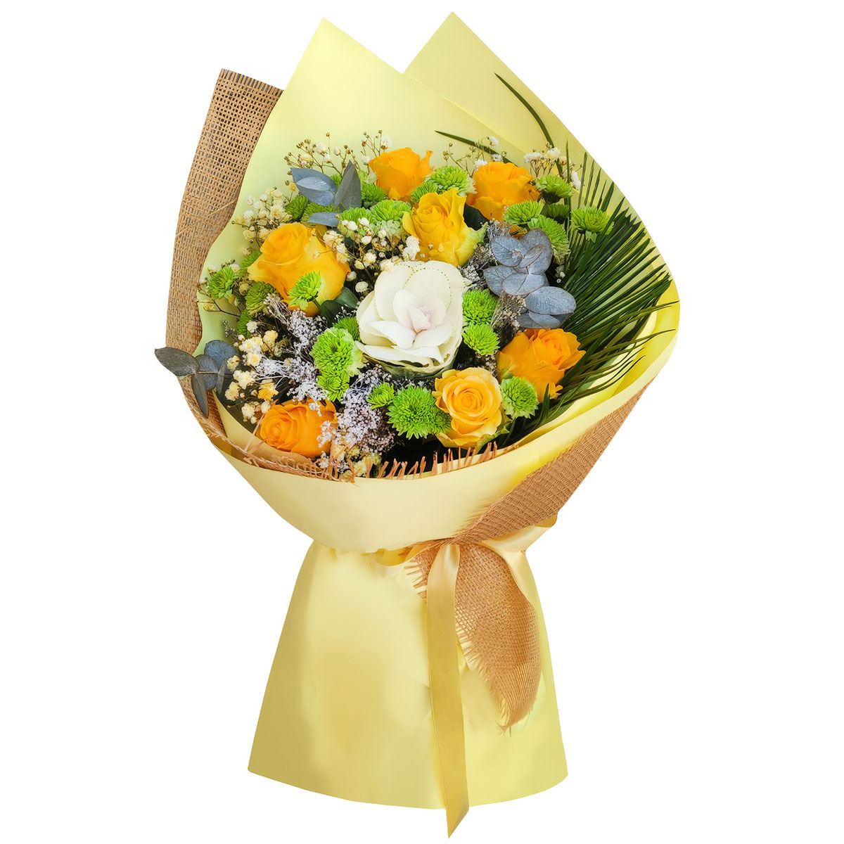 Роза одноголовая желтая, хризантема кустовая зеленая, брассика, гипсофила, листья пальмы, эвкалипт. Упаковка (лента, пленка, крафт, сетка, пленка матовая)