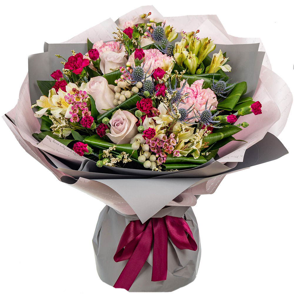 Роза одноголовая светло-сиреневая, эрингиум, гвоздика кустовая мини розовая, альстромерия кремовая, салал, ваксфлауэр, бруния. Упаковка (лента, пленка, крафт, сетка, пленка матовая)
