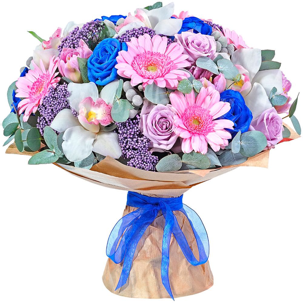 Роза одноголовая синяя и сиреневая, гербера розовая, орхидея белая, бруния, гипсофила, озотамнус, эвкалипт. Упаковка (лента, пленка, крафт, сетка, пленка матовая)