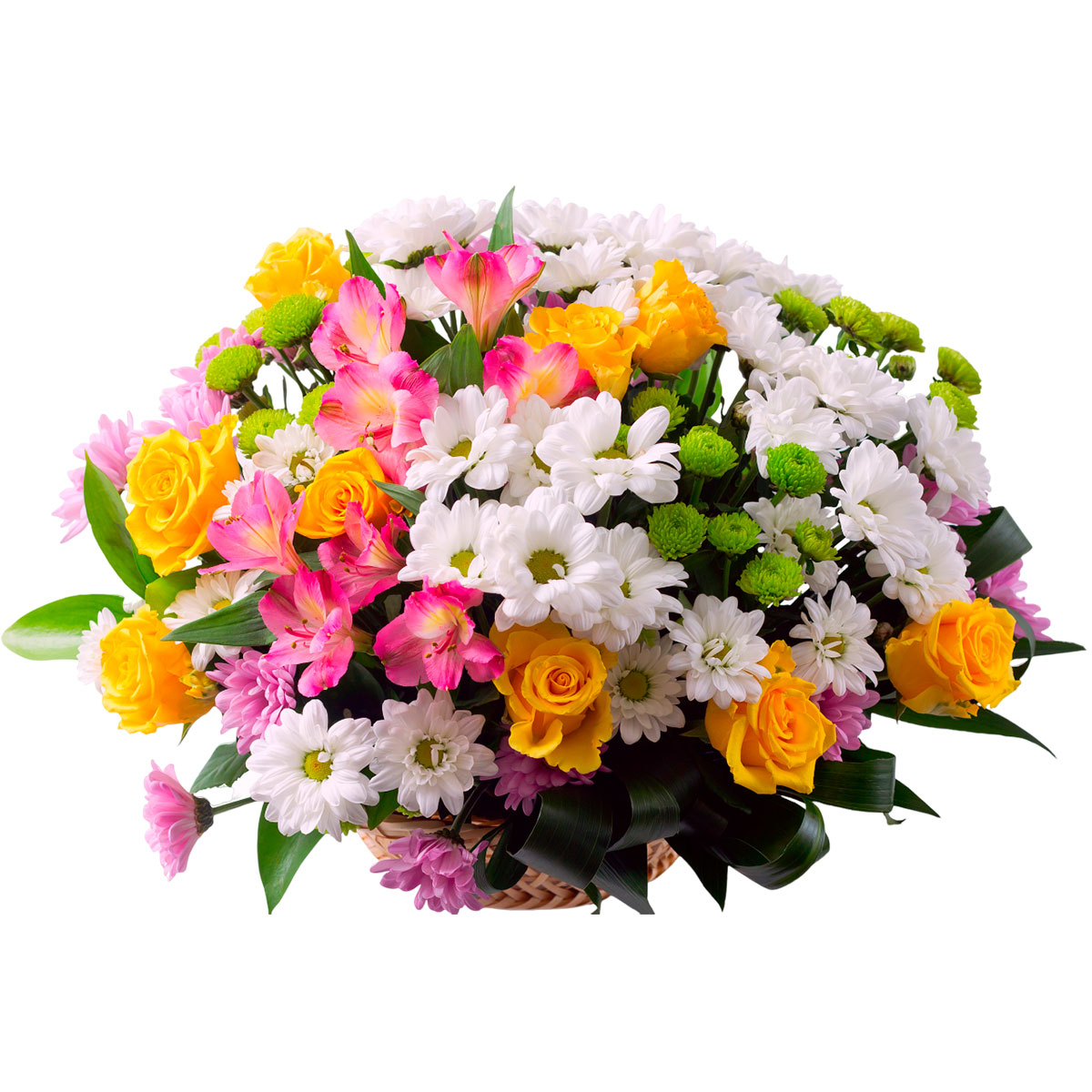Роза одноголовая желтая, альстромерия розовая, хризантема кустовая белая, розовая и зеленая, аспидистра. Упаковка (Корзина, оазис, ящик).