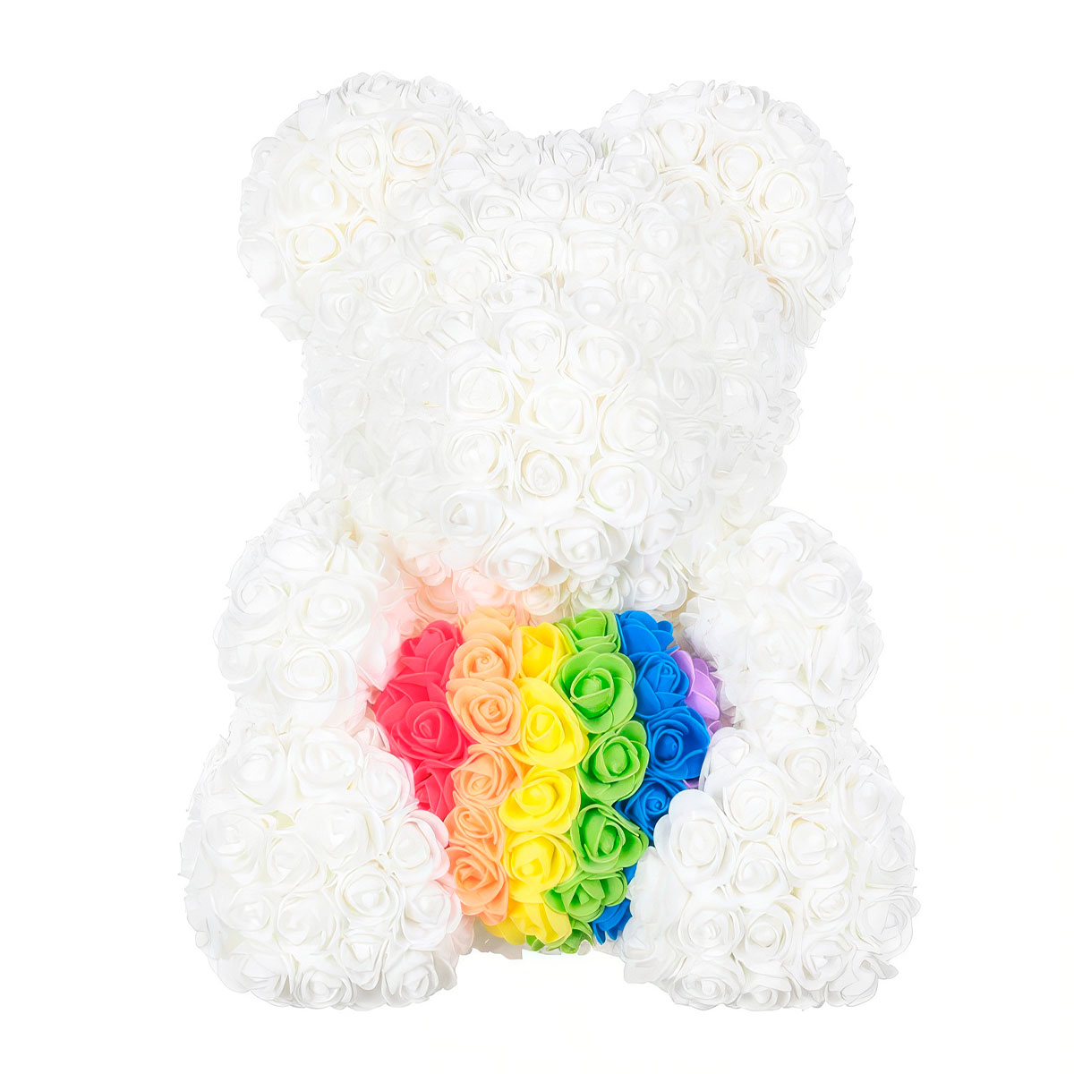 Мишка из роз белый с радужным сердцем — созданный из более чем 600 великолепных 3D розочек.
