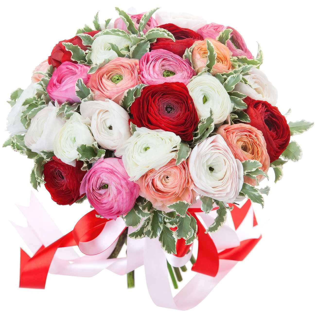 Ранункулюсы красные, белые, роховые, оранжевые.