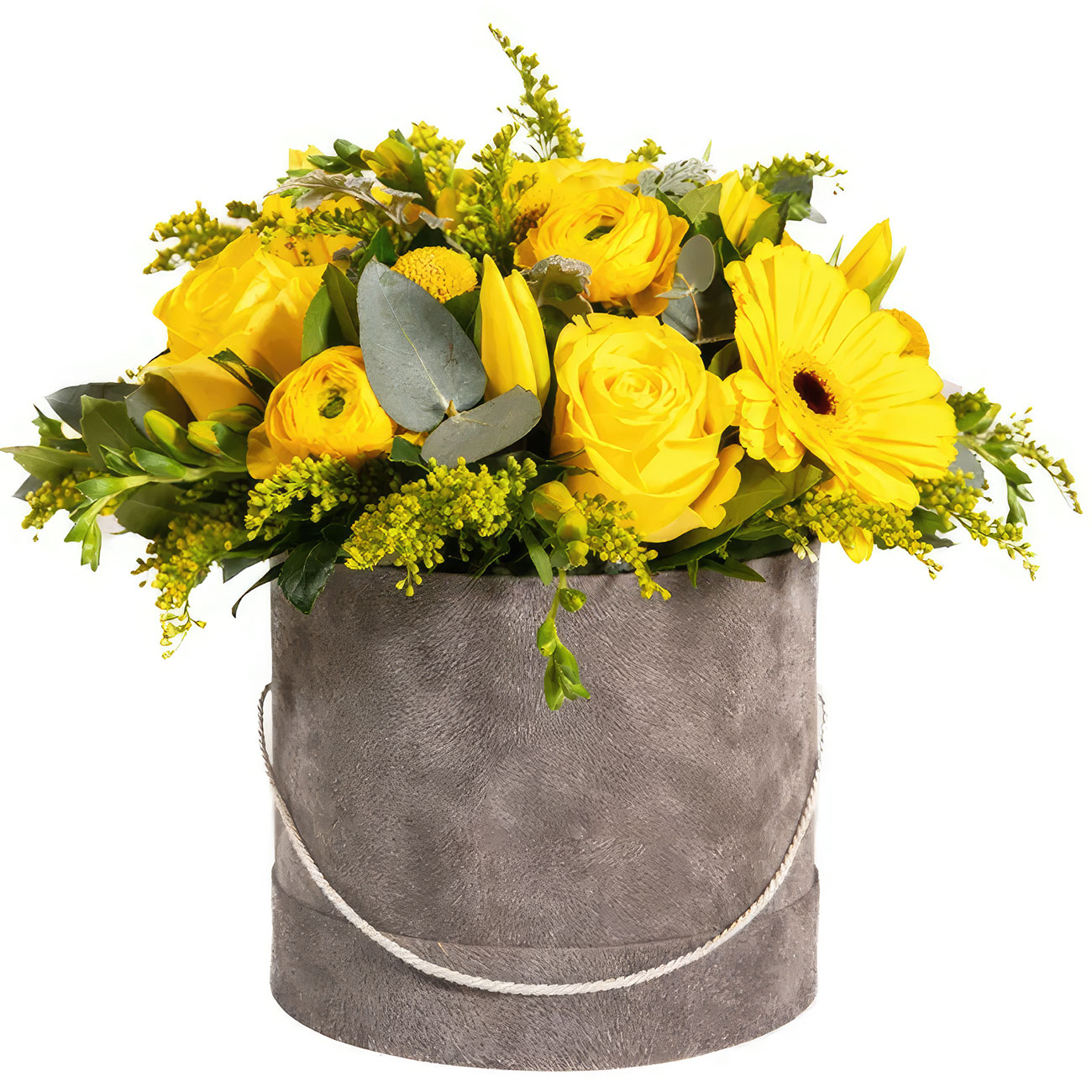 Роза одноголовая желтая, гербера, хризантема кустовая, ранункулюс, тюльпан, фрезия, эвкалипт. Упаковка (шляпная коробка, квадратный бокс, коробка сердце, оазис)