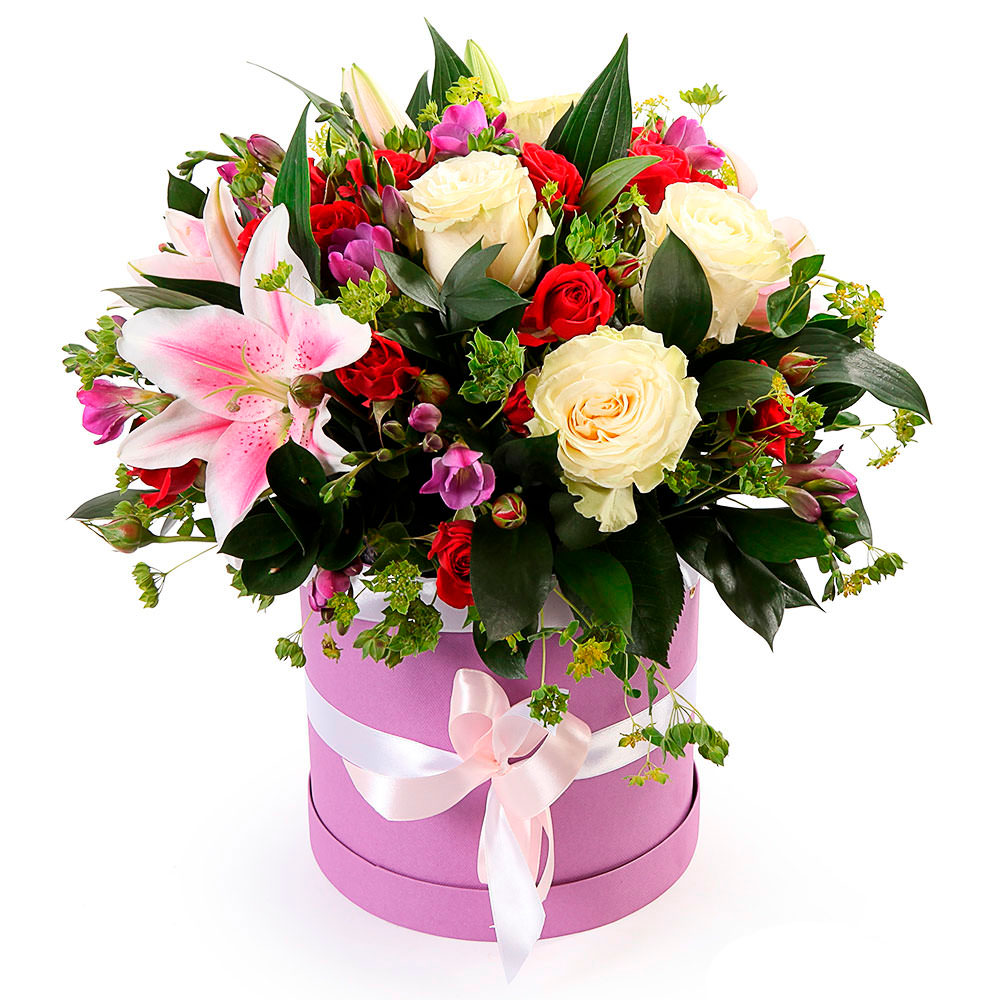 Роза одноголовая кремовая, роза кустовая красная, лилия розовая, зелень микс. Упаковка (шляпная коробка, квадратный бокс, коробка сердце, оазис)