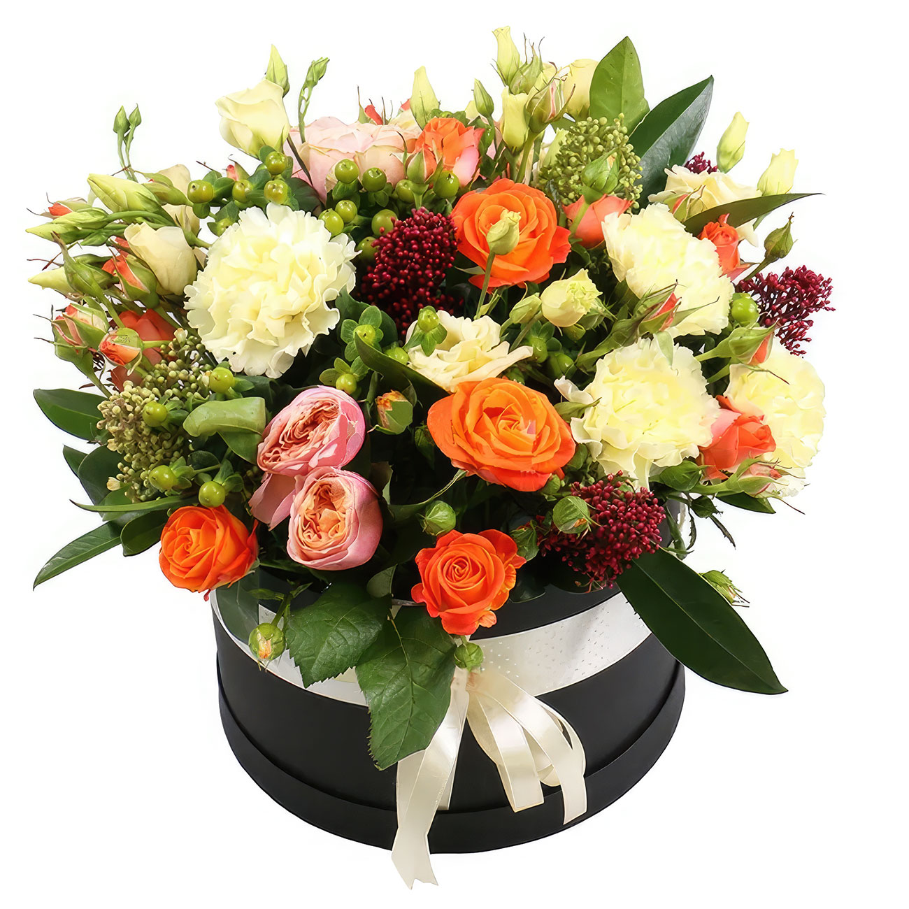 Роза кустовая оранжевая, роза пионовидная розовая, эустома кремовая, диантус кремовый, гиперикум, зелень. Упаковка (шляпная коробка, квадратный бокс, коробка сердце, оазис)